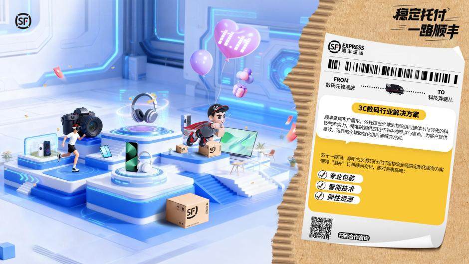 “国补”政策推动双十一期间3C数码高价值订单增长,顺丰为行业打造智能分仓、极速上门与全球协同的数智化供应链方案。顺丰依托全球网络与科技支持,通过专业包装、弹性调度与专业管控,应对履约时效与运输安全挑战,确保关键订单快速可靠送达,助力3C数码行业客户实现供应链升级与旺季服务稳定。