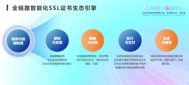 罗赟解释,“全链路智能化SSL证书生态引擎”本质上是一套完整的“自动驾驶系统”,它不仅是优化某个环节,而是通过感知、决策、执行与生态协同四个核心层次,系统性地为企业解决三个核心痛点。”