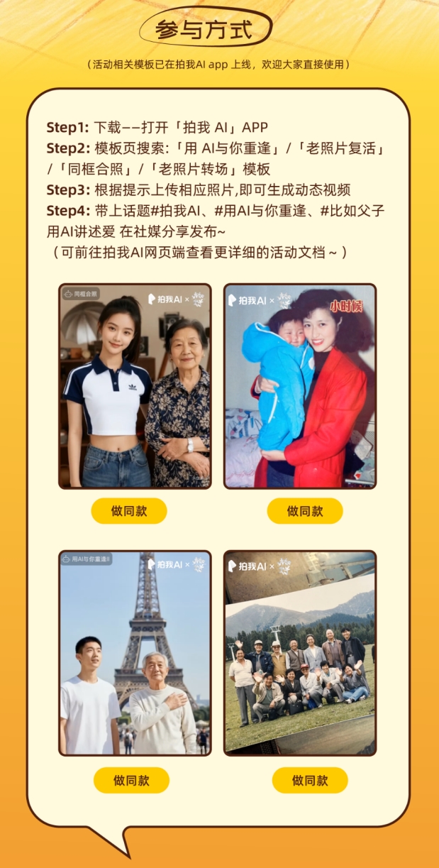 拍我AI通过自有技术,为电影《比如父子》推出一系列活动定制模板(如「老照片复活」,Agent创作中心模板「用AI与你重逢」、「同框合照」等),用户只需上传 1–3 张亲人旧照,即可在拍我AI内置模板中自动生成 8 秒以上的动态影像,让无法再重来的瞬间重新“动起来”。无论是父母年轻时的模糊照片,还是泛黄的家庭合影,甚至上传两张单人照,便可以实现与亲人来一场跨时空旅行和合影,AI 都将成为连接过去与现在的桥梁,帮助更多人向亲人说一句“来不及说的话”,制造更多的情感依赖和寄托。「老照片复活」模板也是海外版产品PixVerse上受全球用户喜爱的长青模板。目前,拍我AI(PixVerse)全球用户规模已突破1亿。