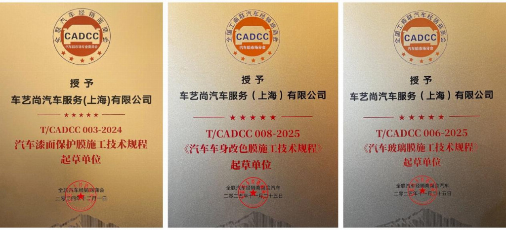 至此,加上已于2024年发布的《汽车漆面保护膜(车衣)施工技术规程》(T/CADCC 007-2024),汽车膜领域的三大核心品类——漆面保护膜、汽车玻璃膜与车身改色膜,均已建立起国家级团体施工标准,标志着行业进入了标准化、规范化的全新发展阶段。值得注意的是,车艺尚作为具备深厚技术积淀的企业,是行业内少数全程参与以上全部三项标准起草工作的单位之一,为整个标准体系的构建贡献了持续的力量。