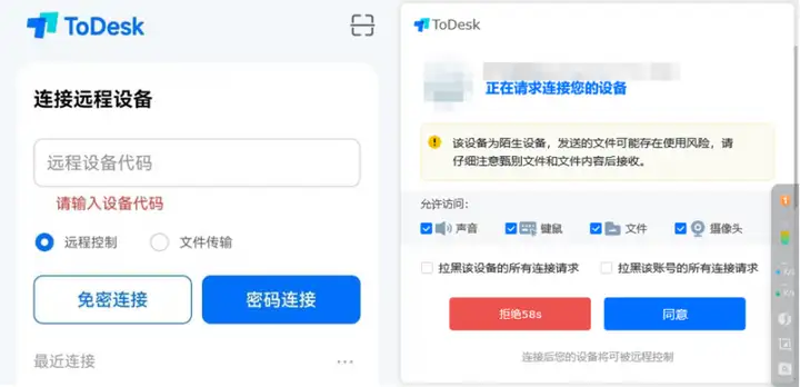在连接流程上,ToDesk彻底颠覆了传统远控软件的繁琐步骤。摒弃了复杂的端口映射和网络设置,用户只需在主控端设备输入或者在被控端设备中授权确认,即可在数秒内建立安全连接。这种“傻瓜式”的操作体验,让技术小白也能轻松完成远程协助。