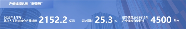 产业规模量质齐升。数据显示,截止目前,人工智能核心产业规模持续增长,2025年上半年,全市人工智能核心产业规模2152.2亿元,同比增长25.3%。初步估算2025年全年,产业规模有望超过4500亿元。AI企业超2500家,已备案大模型183款,持续保持全国第一。产业链日趋完整,形成了具有全球竞争力的产业生态。同时,商业化路径也逐渐清晰,百度、抖音等公司的营收和产品活跃用户数均创新高。北京正以前所未有的速度,持续建设“人工智能第一城”。
