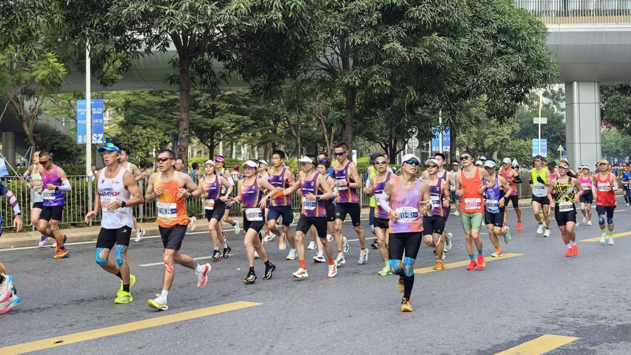 当终点拱门映入眼帘,海滨广场人声鼎沸。伴随着志愿者的呐喊与观众的欢呼,这支紫色方阵齐齐冲线,有人振臂高呼,有人激动落泪,汗水浸透的战袍下,是掩饰不住的激动与荣耀。