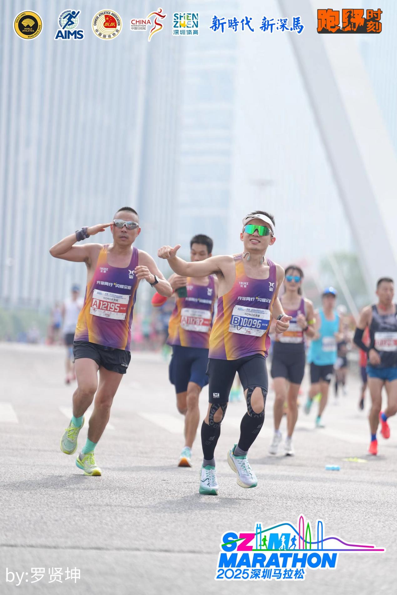 一路上,队员们相互鼓劲、用默契与坚持诠释着 “闪电队” 的速度与激情。42.195公里的征途,不仅是体力的较量,更是心态的博弈。当官方氛围组从福田的热情磅礴演绎到南山的国风雅韵,再到前海的国际化声浪,充客闪电队始终保持着高昂的斗志,频频向沿途热情的观众挥手致意。