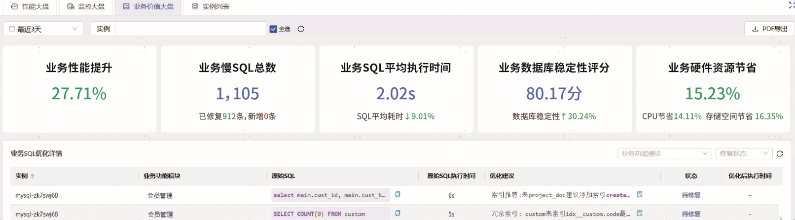 可实现SQL性能提升20%-40%,运维效率提升10%-30%,资源成本降低5%-10%。所有优化效果均通过价值大屏实时呈现。DBA(数据库管理员)的工作量及工作价值也得到了量化评估,从SQL优化、故障排查到资源管理,每一项任务的效果均可通过数据追踪与评估,帮助DBA团队提升工作效率并明确其贡献价值。这种双重量化机制不仅提升了整体运营效率,还为决策层提供了可靠的数据支持,助力企业实现降本增效与可持续发展。