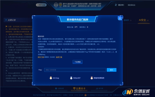 围绕人工智能等新技术带来的安全挑战,本次赛事设置了人工智能与供应链安全相关赛题方向,通过模拟金融行业信用卡欺诈检测业务场景,构建AI大模型安全测试环境。参赛选手需对预置模型开展安全分析,识别并利用其潜在风险点,完成针对模型决策逻辑的攻击验证,以检验其在新型业务场景下的安全分析与应对能力。通过真实业务场景设计,考察了选手对AI安全核心技术的掌握水平,提升了其在复杂业务场景下解决新型安全问题的实战水平。