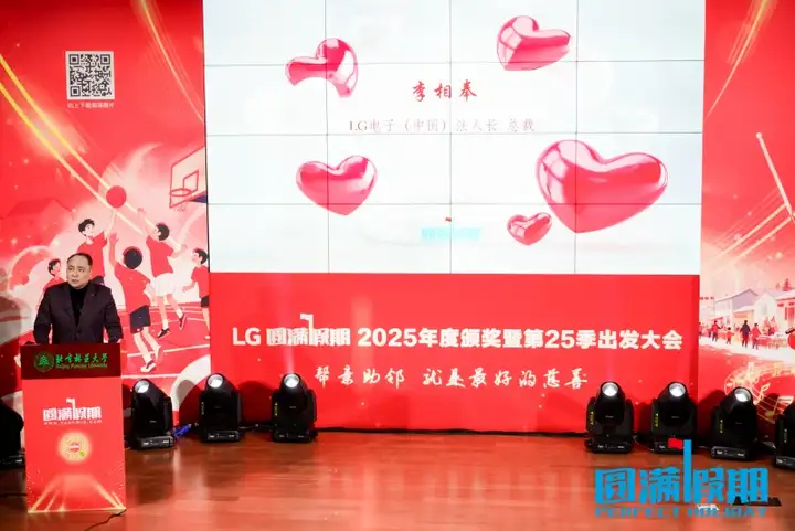 12月28日,由LG集团与北京圆网慈善基金会共同主办的“LG圆满假期”2025年度颁奖暨第25季出发大会在北京林业大学盛大举行。LG电子中国法人长、总裁李相奉,北京圆网慈善基金会理事长付一然,以及社会各界嘉宾、高校代表、大学生志愿者等齐聚一堂,共同见证这一满溢爱与责任的温暖时刻。